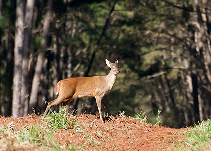 Habitante de los montes de rutina nocturna, este animalito se alimenta de pasturas, frutos y hongos. El macho se diferencia de la hembra por cornamenta fina de hasta 15 centímetros de largo.